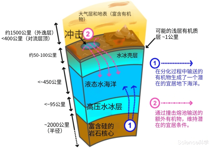 这些有机物可能通过两种方式进入地下海洋:一种是陨石撞击冰壳时,撞击产生的热量融化冰面,形成“融池”,有机物随融水渗入;另一种是从岩石核心向上“漂移”进入海洋。